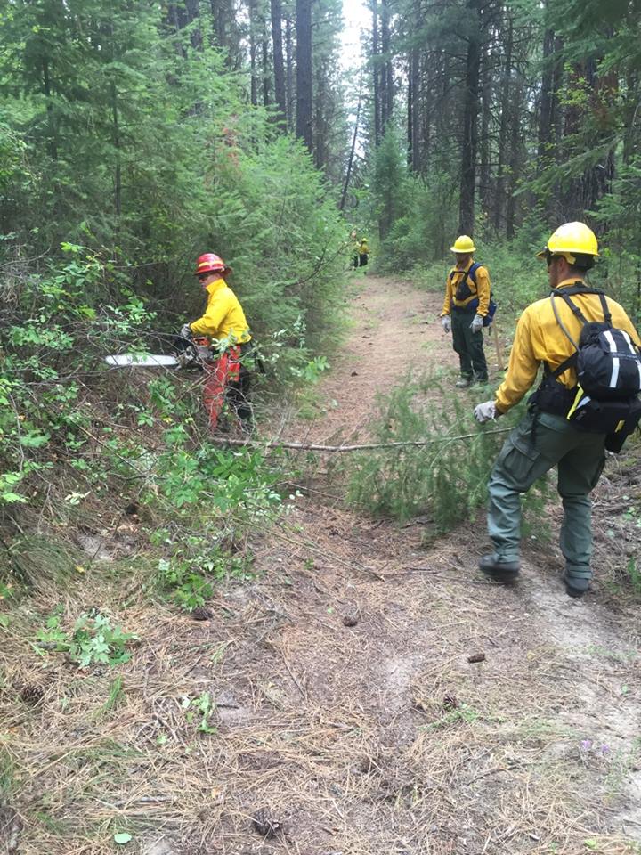 Crews working by “brushing out” a forest road to allow access for incident vehicles. This particular road leads to multiple lookout locations on the fire, which is important for safety, operations and fire behavior personnel.