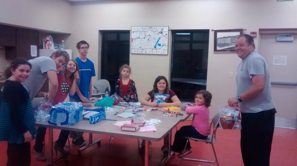 Girlscouts assembling carepackages for firefighters.