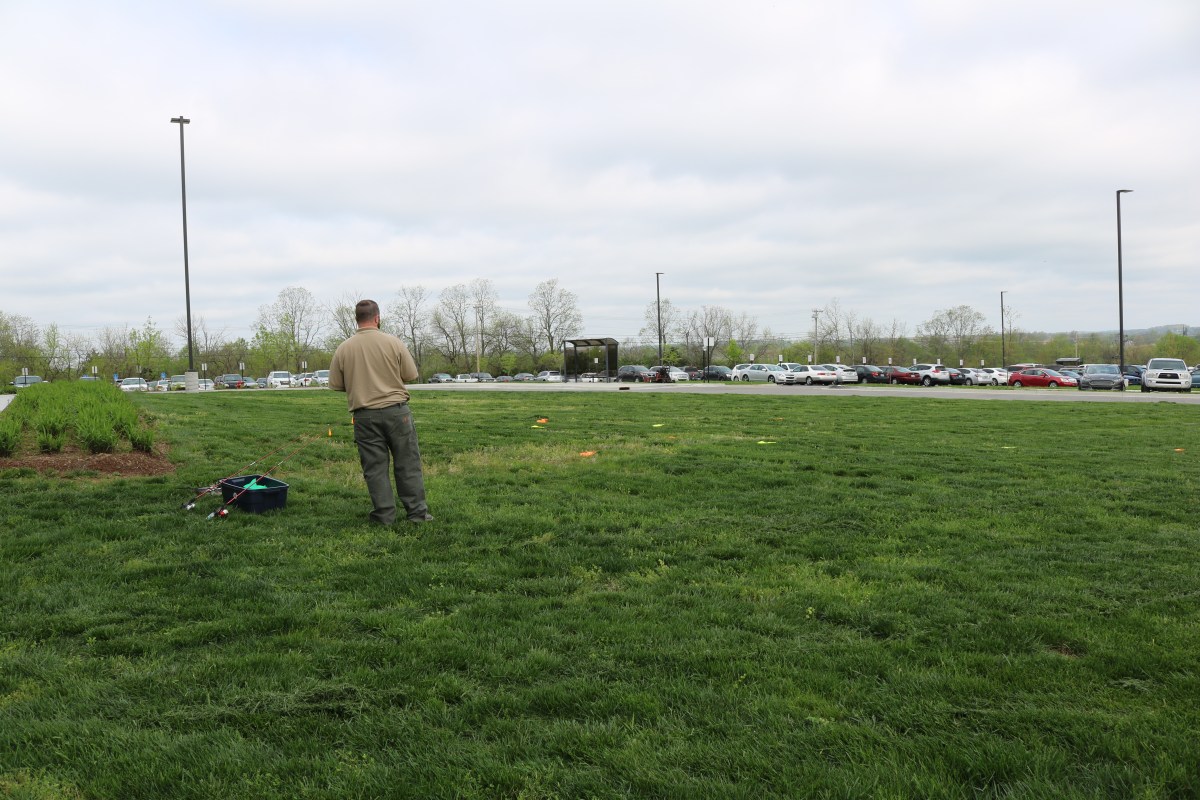 Jamie Cook displays a fishing games from Fish and Wildlife