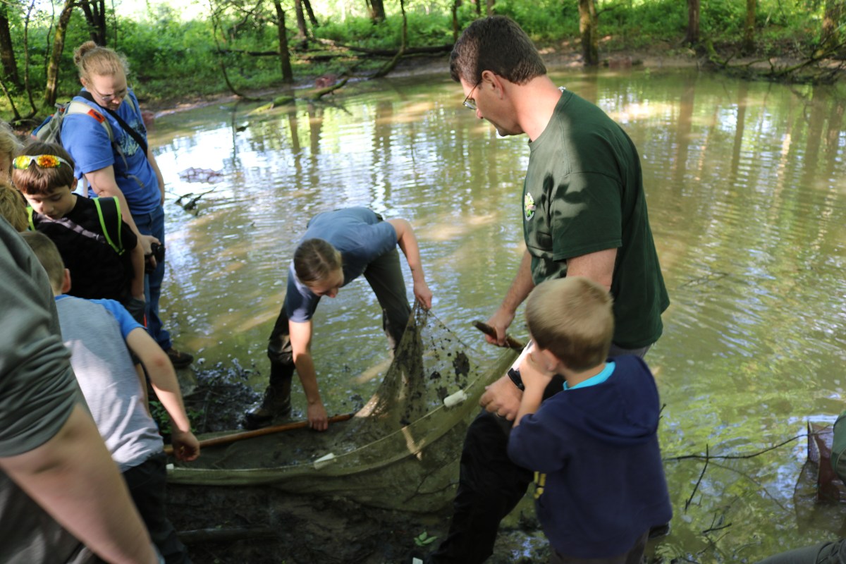 Weese works to dredge a cow pond at Floracliff to show and identify species native to the area. Photo by Carrie Searcy.