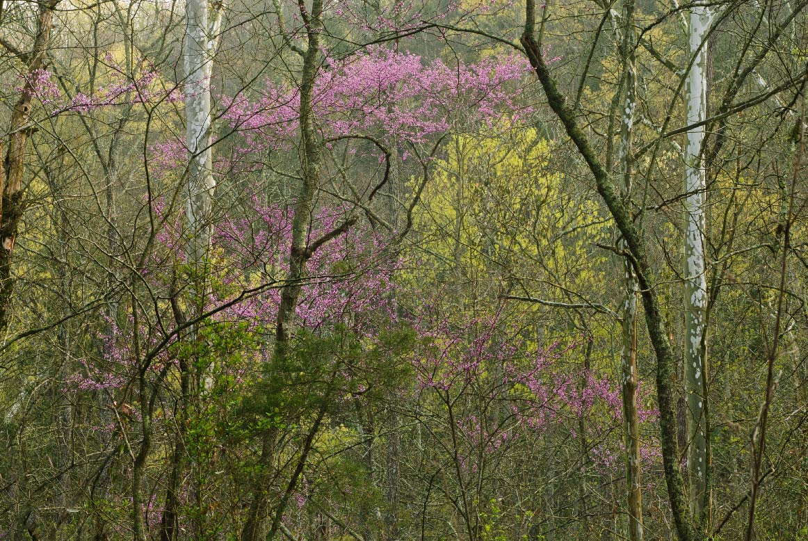 At Lincoln’s Boyhood Home redbuds in bloom in a valley. Photo by Thomas G. Barnes.
