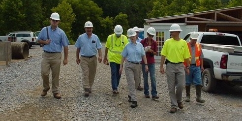 Marilyn, center, walks with a group onsite during an inspection.