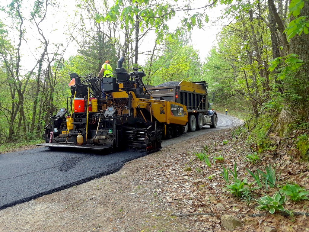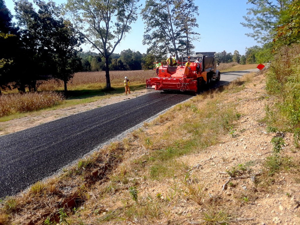 Scotty’s Contracting and Stone applies a thin overlay of RMA to Hatcher Valley Road in Hart County.