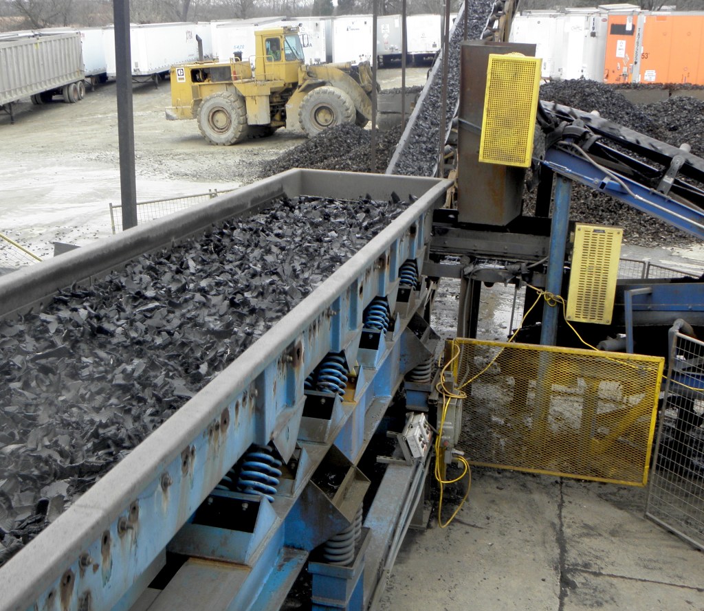 Waste tires are loaded onto a conveyor belt at the Liberty Tire facility in Marion where metal and fibers are removed and the tires are shredded. Photo by John Brown, Recycling and Local Assistance Branch.